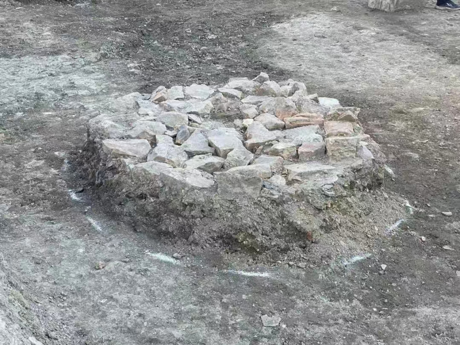 磉墩之上,再安柱础、立柱子。现场翻土中,也出了一些石构件,包括柱础和带铭文的石柱。经专家初步释读,上面刻有时间、地点等信息。